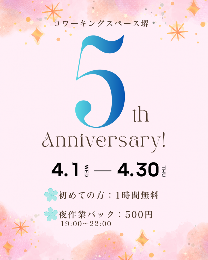 東洋ビル1階のコワーキングスペース堺は、おかげさまで5周年を迎えます。